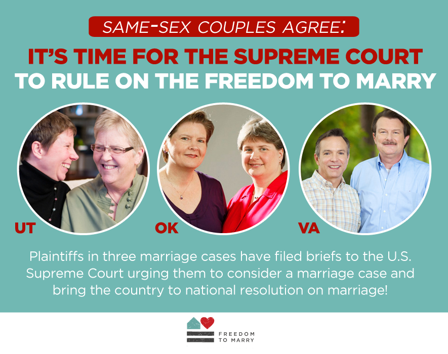 This week, plaintiff couples in three different marriage cases filed briefs with the United States Supreme Court replying to writs of certiorari from defendants in the cases. In the briefs, the plaintiffs make the case that it's time for the Supreme Court to consider a marriage case - and that every day where same-sex couples and their families must wait for the freedom to marry is a day where those families are harmed.