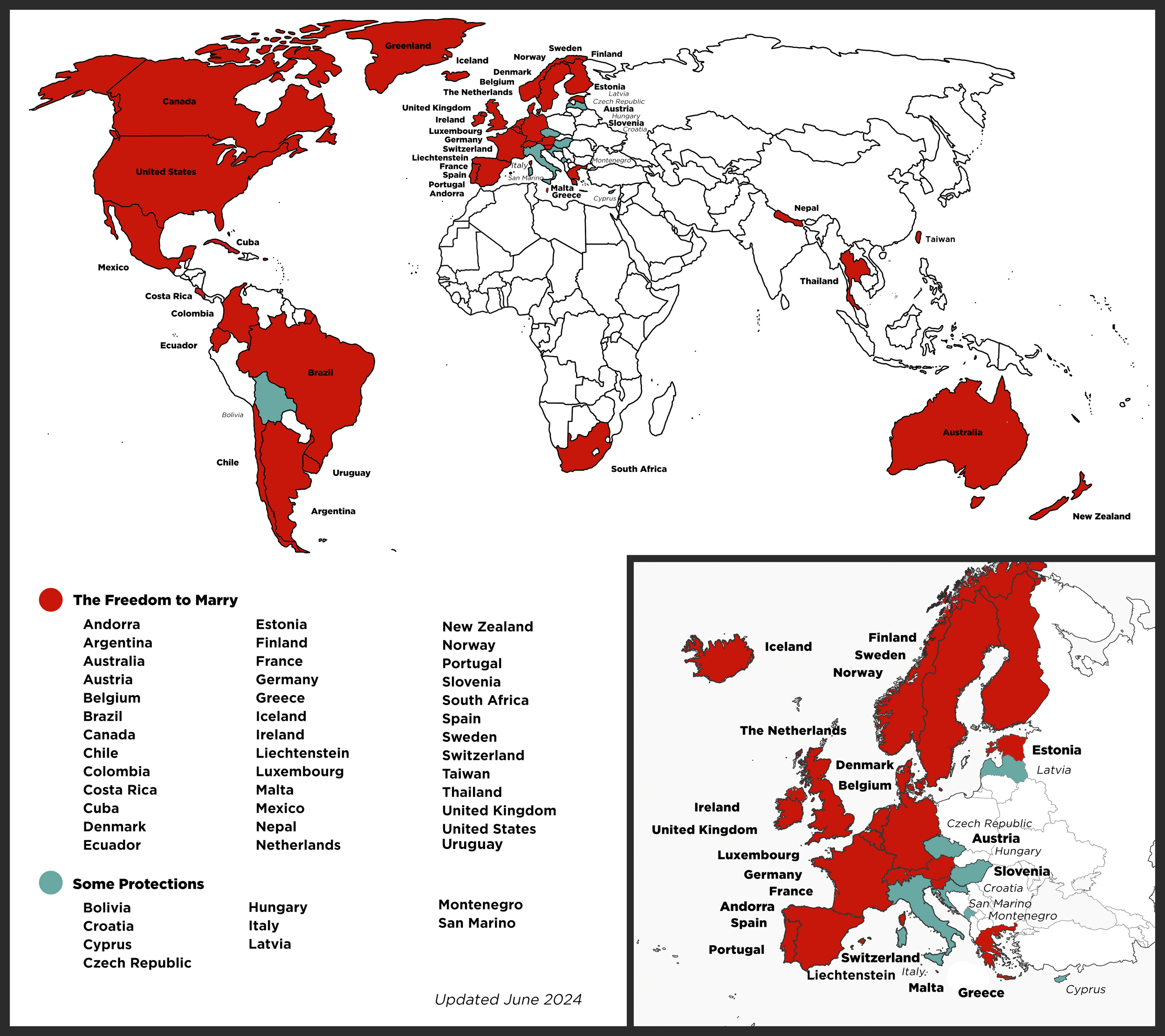 As of April 2023 same-sex couples can share in the freedom to marry in 34 countries on all 7 continents (up from zero less than 20 years ago). Over 16% of the world's population – more than 1.2 billion people – now live in countries with the freedom to marry. Many other countries provide some protections, short of marriage, for such couples. As global leaders, businesses, and people around the world gradually grow to understand that families are helped, and communities and countries made stronger, by protecting all loving committed couples, the momentum for the freedom to marry and human rights worldwide will continue to advance.