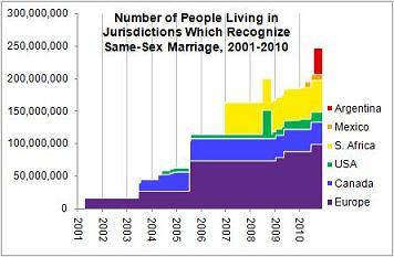 "Although the past year has been frustrating to liberals and libertarians on many levels, one exception is in the increasing willingness of governments around the world to recognize the freedom to marry, as Argentina determined to do [Wednesday]. There are now about 250 million people worldwide living in jurisdictions which provide for marriage equity, as this colorful chart will help to demonstrate.