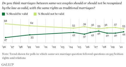 "Opponents of legalizing the freedom to marry continue to outnumber supporters in the United States, by 53% to 44%. However, opposition is now tied for the lowest Gallup has measured. Support was slightly higher, at 46%, in 2007.