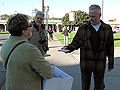 "She's holding a sign drawing attention to her DVD to Art project. At her feet are three cardboard collection boxes. Parishioners arriving for early morning mass start filling them up, tossing in the DVDs they received in the mail.