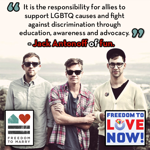 fun. has been directing some of their newfound spotlight to the freedom to marry, speaking out whenever they can about why marriage matters to same-sex couples and why allies should stand up for same-sex couples. They're the headliner on the REVERB Campus Consciousness Tour, which is designed to educate and mobilize students across the country to take positive action toward LGBTQ equality. They've recorded videos for the Human Rights Campaign and Ben & Jerry's about why they support marriage for same-sex couples. And now, they're one of the bands involved with our Freedom to Love Now! concert, which will benefit Freedom to Marry and our campaign to win marriage nationwide. You can buy tickets to see fun. at the concert in New York City HERE.