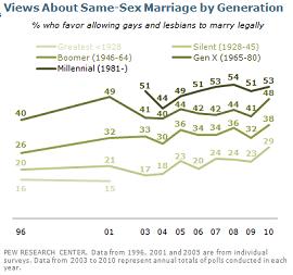 "Support for marriage for same-sex couples has also been rising rapidly, from 27 percent in 1996 to 42 percent in 2010. On this question, independents are closer to Democrats than Republicans in viewing the freedom to marry as not a big deal.