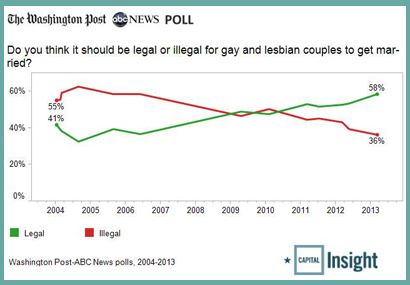 A new poll from The Washington Post and ABC News signals the continued growth of the majority of Americans who support the freedom to marry for same-sex couples. Fifty-eight percent of people surveyed in a new survey, released this afternoon, said they support marriage for same-sex couples.
