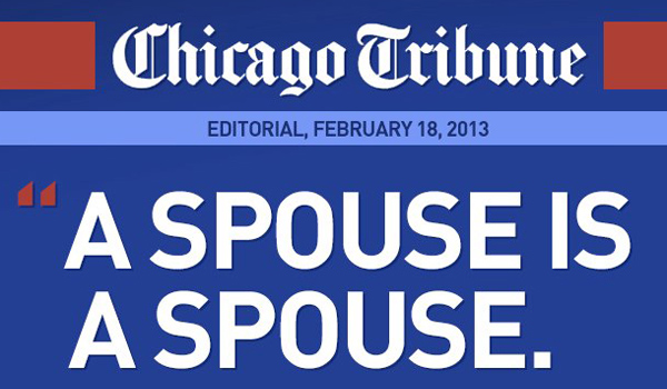 This weekend, The Chicago Tribune published a supportive editorial, explaining "A spouse is a spouse" and adding, "Ladies and gentlemen of the House, it's your turn to step up." Yesterday, a Crains/Ipsos poll of 600 adults indicated that 50 percent of respondents support the marriage bill, and only 29 percent oppose it. That's a historic 21-point margin of people in the state who favor the freedom to marry.
