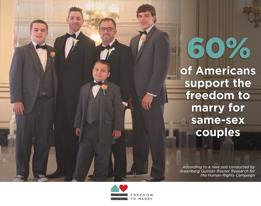 Last week, a new poll tracked record-high support for the freedom to marry, with 60% of respondents saying they support marriage for same-sex couples. Just 37% of the respondents, likely voters, said they did not support marriage for all. The poll was conducted by Greenberg Quinlan Rosner Research for the Human Rights Campaign.