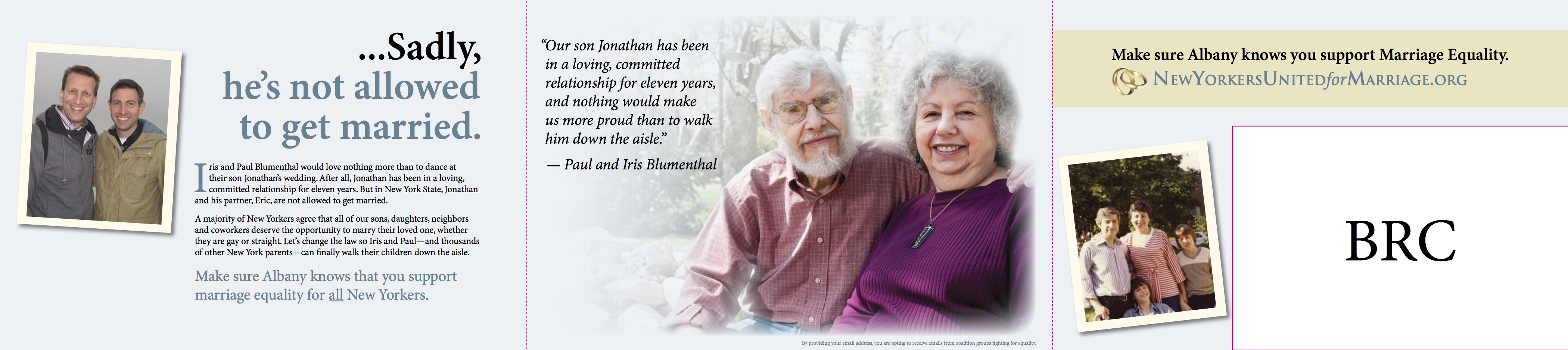 New Yorkers United for Marriage - a coalition of 5 LGBT organizations including Freedom to Marry that are working to win marriage in NY this year - released its first mailer today that will be sent to 200,000 households in New York urging voters to contact their Senators in support of marriage for gay and lesbian couples. The mailer features Paul and Iris Blumenthal, a married couple in New York who "would love nothing more than to dance at their son Jonathan's wedding."