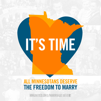 The scheduling news comes as the latest addition to the momentum Minnesota has experienced in the past year. In March, marriage bills advanced through the House Civil Law Committee and the Senate Judiciary Committee, and just yesterday, the MN House Ways & Means Committee also voted to advance the bill to a full floor vote. This month, polling has registered majority support for marriage in the state, and Minnesotans United for All Families, the coalition working to pass a marriage bill in 2013, has been continually hard at work making the case for why marriage matters across the state.
