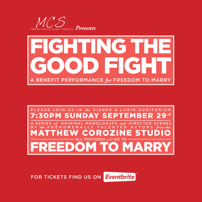 Next week, Freedom to Marry is proud and grateful to be a part of a benefit performance organized by Matthew Corozine Studio Theater, Inc.! MCS will be hosting "Fighting the Good Fight," a benefit performance for Freedom to Marry on Sunday, September 29 at 7:30pm in the Eisner & Lubin Auditorium.